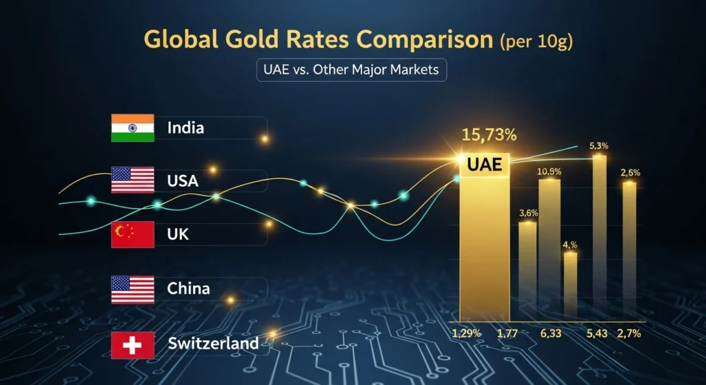 Comparing the gold rate in the UAE with other countries helps buyers understand whether local prices offer better value. Differences in taxes, import duties, and currency exchange rates often cause noticeable price gaps. This section solves that by clearly comparing UAE gold rates with major international markets.